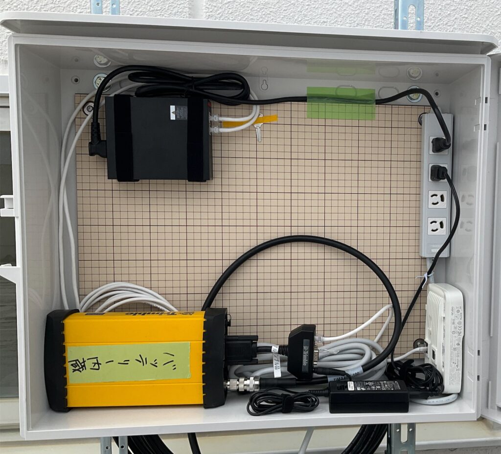 今回はニコン・トリンブル社製のGNSS受信機を借用し、GNSS受信基地局の構築を行った。