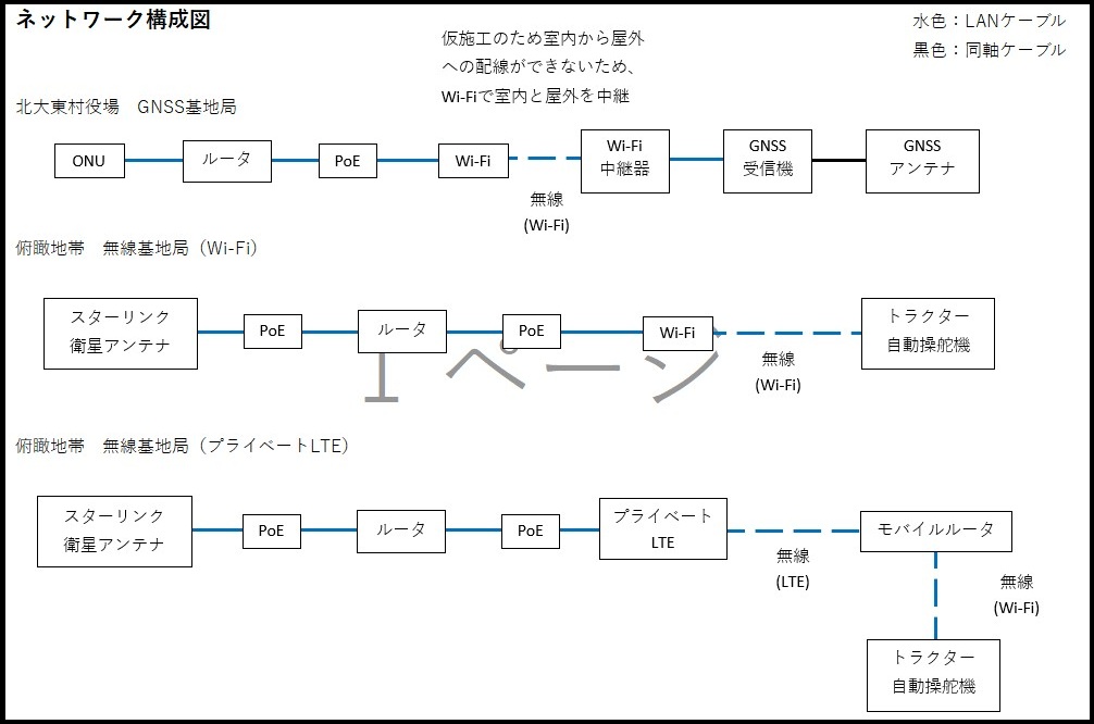 今回、北大東村役場にGNSSの受信基地局を設置し、RTK-GNSSの環境を構築。俯瞰地帯においては、インターネット環境がないため、衛星を活用したStarlinkを採用し無線基地局を構築した。無線基地局では屋外用Wi-Fi及びプライベートLTE(sXGP)を利用して、それぞれの電波が利用可能なエリアの確認を行うとともに、農業用トラクターで自動操舵機を利用できるかの確認を行った。